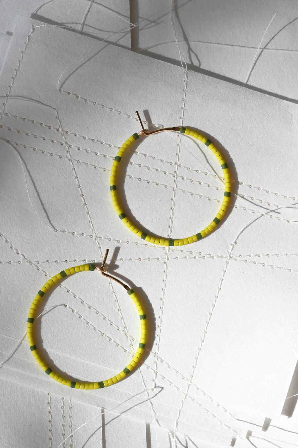 Materials – Japanese glass seed beads, hand-hammered 14k gold-filled wire hoops