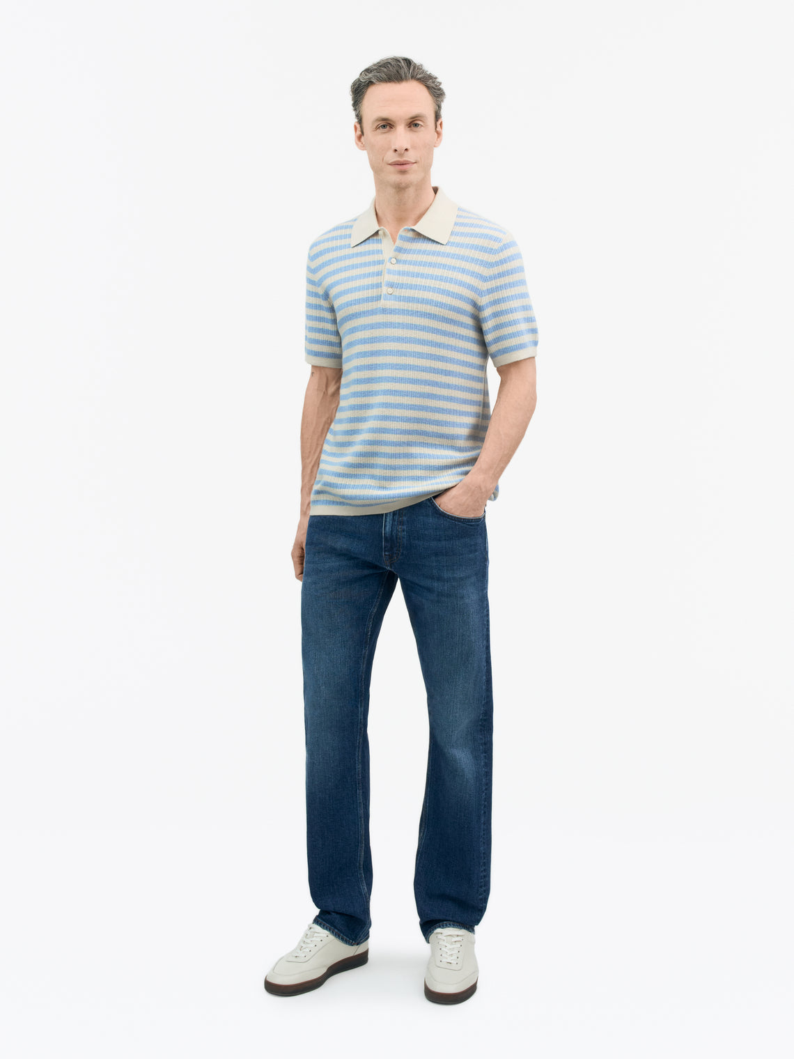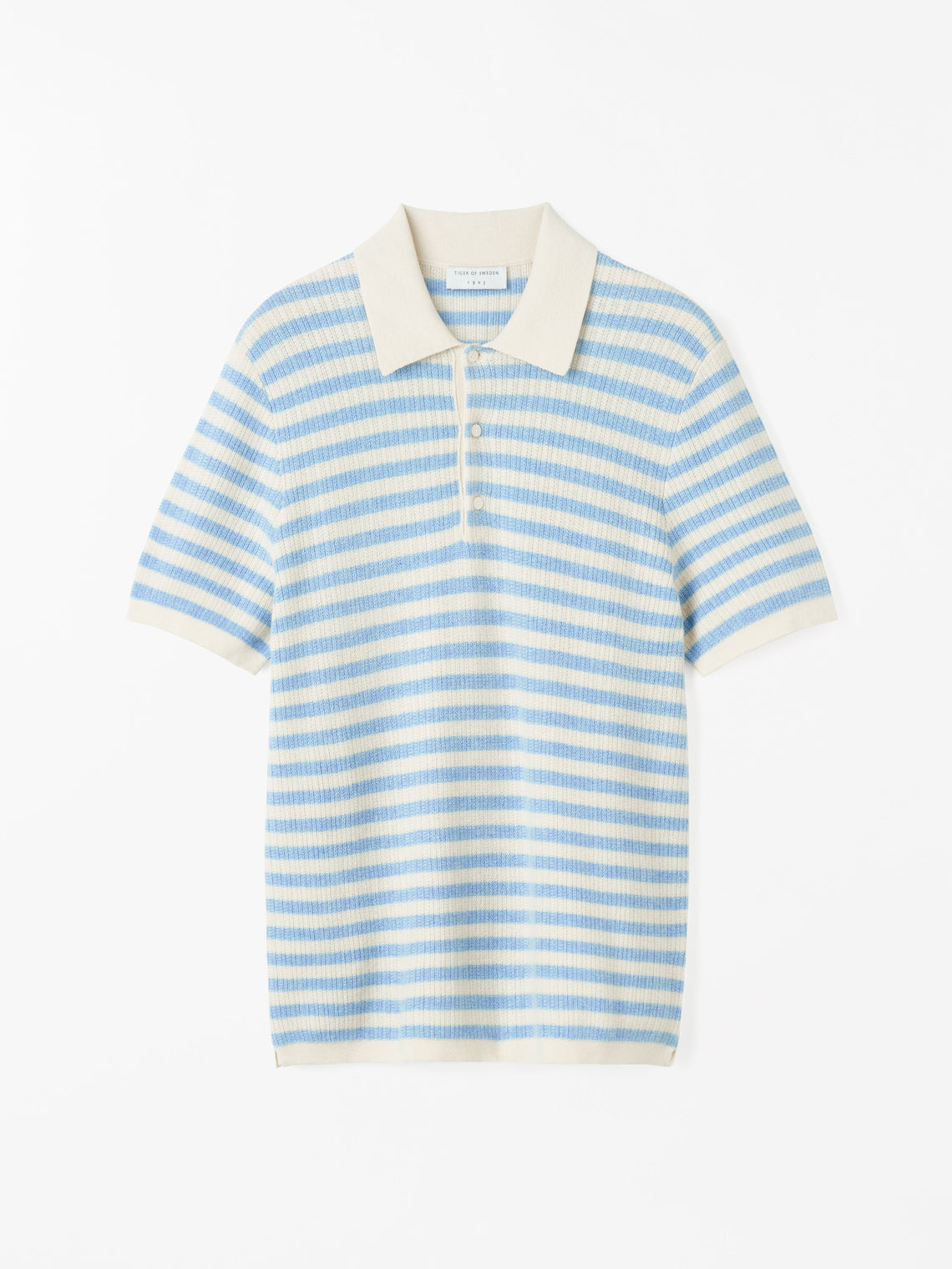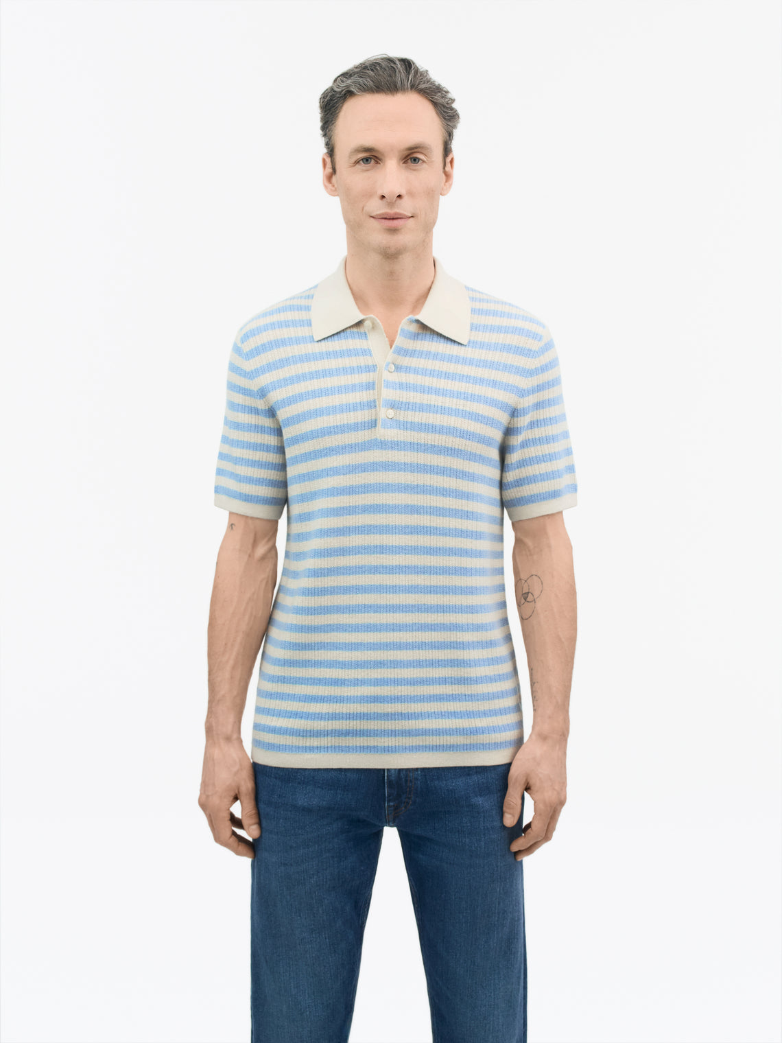 Erros is a casual polo-neck sweater with short sleeves. Designed for easy layering under a jacket or knit crew-neck sweater, its button closure has a placket. Jersey stitched through the body and sleeves, it has full-needle stitching at the collar and bottom hem and tubular trim at the bottom of its sleeves. The classic look is completed with French shoulder construction and fashioning details.