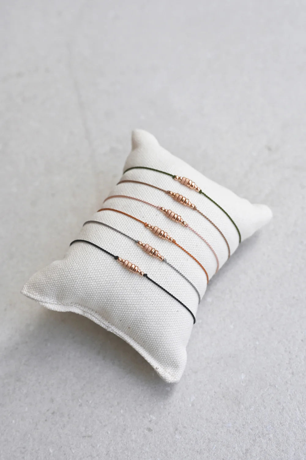 Our friendship bracelet, with a touch of rose gold, is a sophisticated update of a childhood favorite. Friendship Bracelet No.5 is a simple silk cord bracelet adorned with smooth and shimmery textured 14k rose gold-filled beads.
